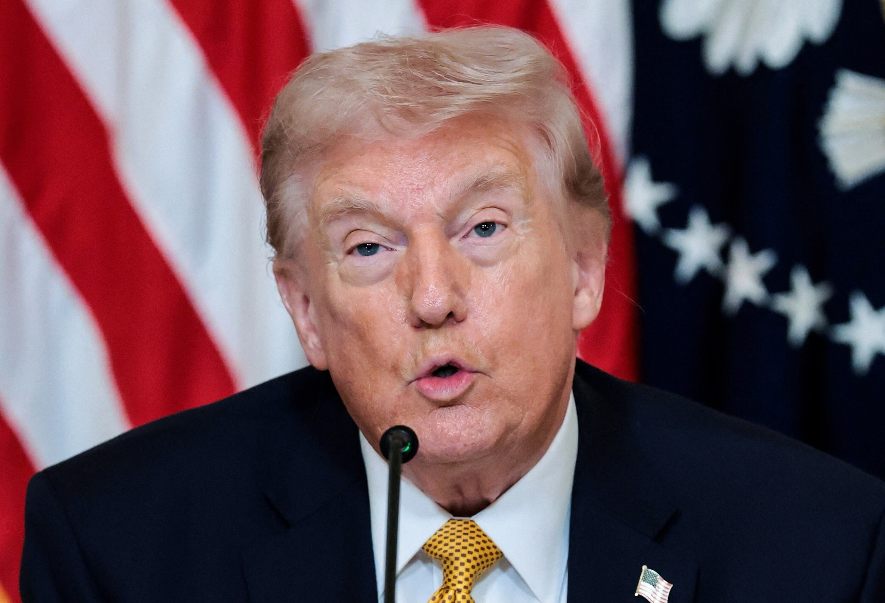 President Donald Trump speaks during a lunch with the Kennedy Center board members in the East Room of the White House in Washington, March 16, 2026.