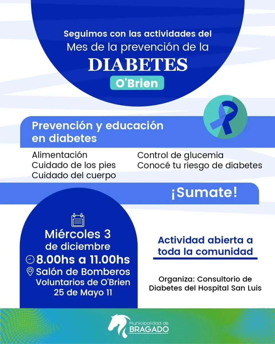 En el marco de las acciones locales por el Mes de la Prevención de la Diabetes, el Consultorio de Diabetes del Hospital San Luis llevará adelante una jornada destinada a promover hábitos saludables y brindar herramientas de control y detección temprana.