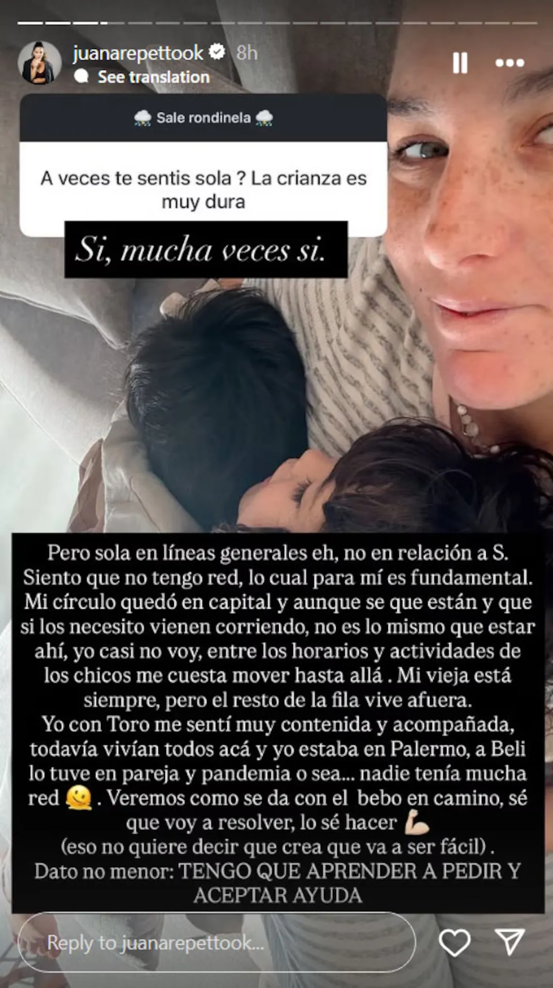«A Beli lo tuve en pareja y pandemia, o sea… nadie tenía mucha red. Veremos cómo se da con el bebé en camino. Sé que voy a resolver, lo sé hacer… Eso no quiere decir que crea que va a ser fácil. Dato no menor: tengo que aprender a pedir y aceptar ayuda», se sinceró, Juana, a través de su cuenta de Instagram.