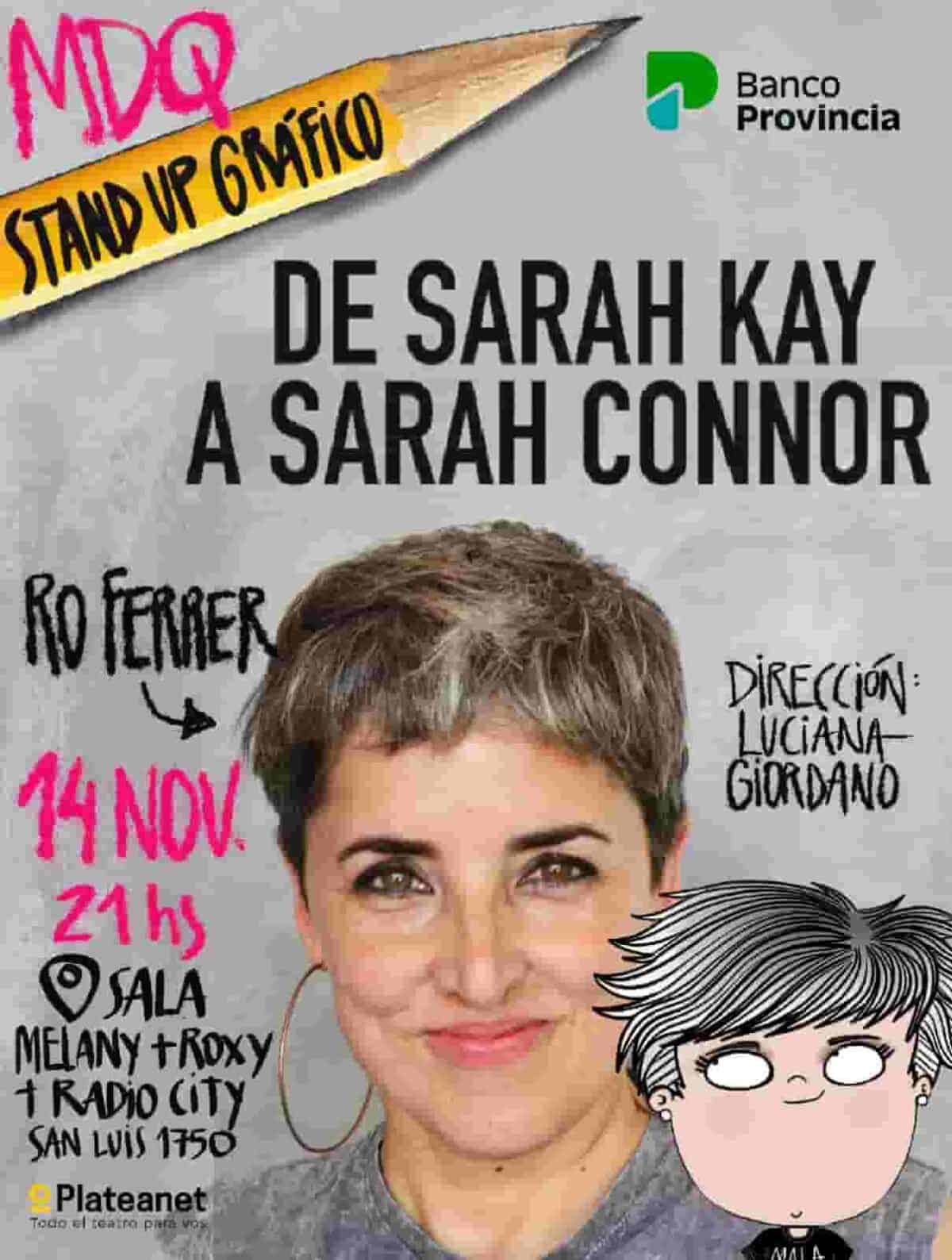 Y lo hace en su segundo hogar: Mar del Plata. Sí, el próximo 14 de noviembre a las 21, la sala Melany del Centro de Arte Mdq (San Luis 1750) la verá subir a las tablas por primera vez. Las entradas ya están a la venta a $15 mil en Plateanet https://www.plateanet.com/obra/32576?obra=RO%20FERRER%20DE%20SARAH%20KAY%20A%20SARAH%20CONNOR&paso=inicio y boletería de la sala.