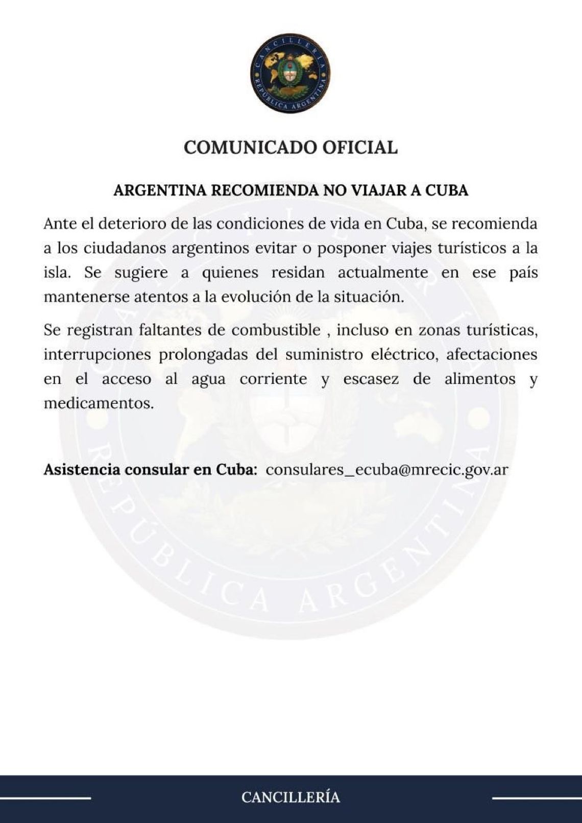 A través de un comunicado oficial, la Cancillería, a cargo de Pablo Quirno, advirtió que “ante el deterioro de las condiciones de vida en Cuba, se recomienda a los ciudadanos argentinos evitar o posponer viajes turísticos a la isla”, y sugirió a quienes se encuentren en ese país “mantenerse atentos a la evolución de la situación”.