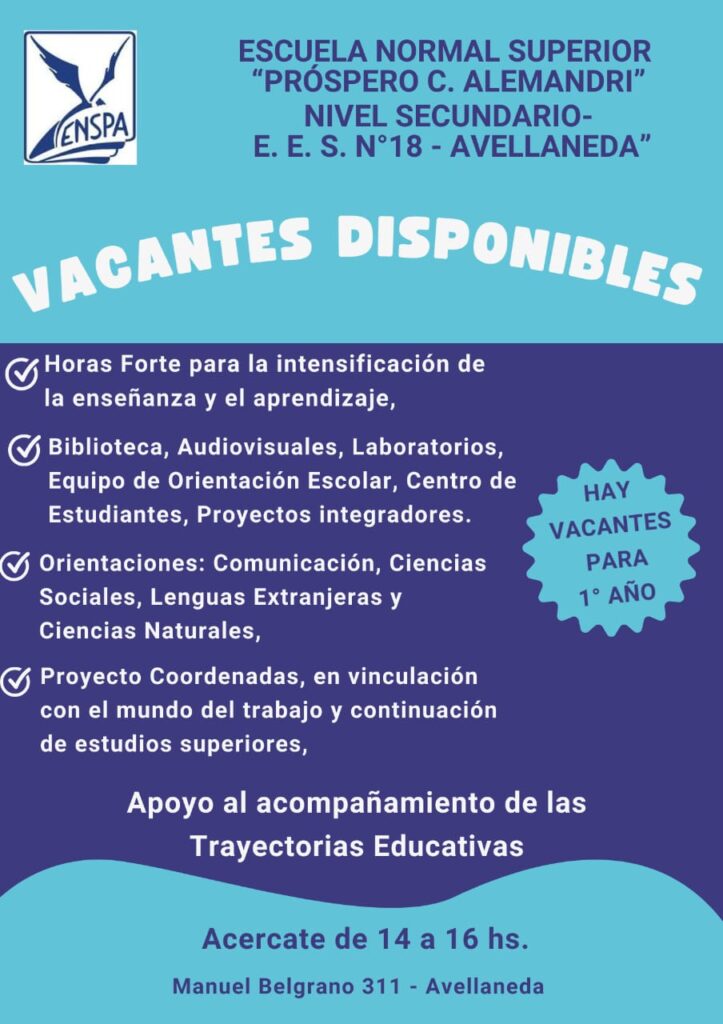 La Escuela Normal Superior “Próspero C. Alemandri” (ENSPA) de Avellaneda informó que continúa abierta la inscripción para el ingreso a primer año del nivel secundario, de cara al próximo ciclo lectivo.
