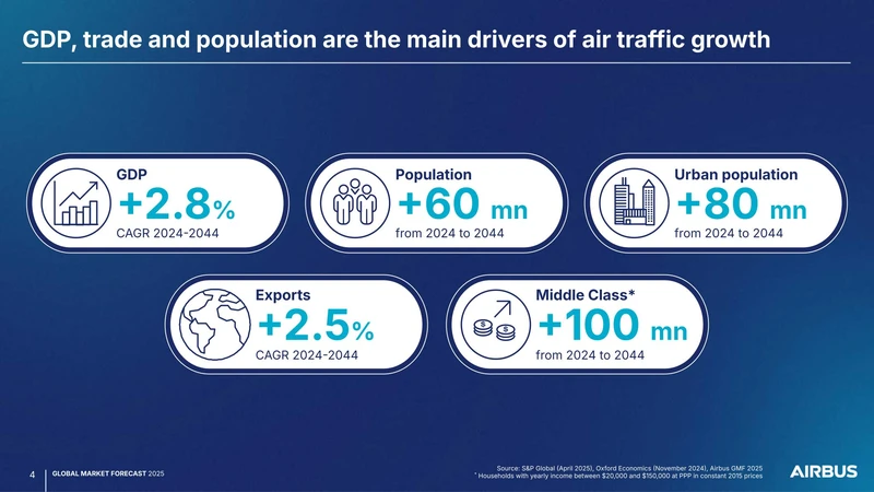 Airbus atribuye este auge a varios factores socioeconmicos. La poblacin urbana en la regin seguir creciendo, situndose como la segunda mayor del mundo en 2044. Paralelamente, el tamao de la clase media alcanzar los 500 millones de personas, impulsado por un incremento del PIB regional del 2,8% anual.