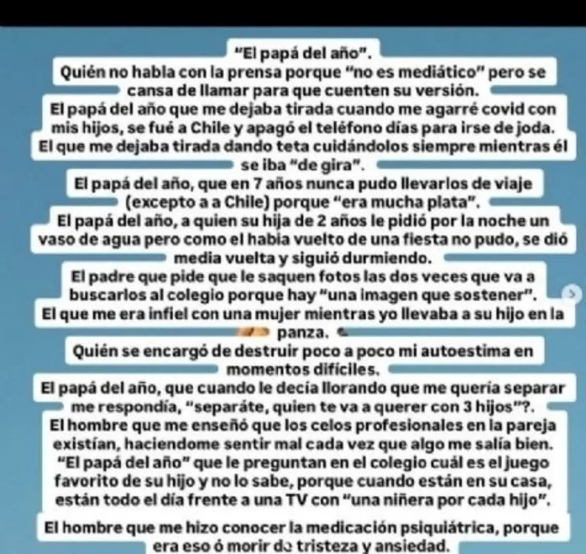 En el extenso texto, titulado irónicamente «El papá del año», Suárez describe episodios de abandono, destrato y ausencia por parte de Vicuña: “El papá del año que me dejaba tirada cuando me agarré covid con mis hijos, se fue a Chile y apagó el teléfono días para irse de joda”, escribió, maría Eugenia, meses atrás, en sus redes sociales, dejando al descubierto una terrible interna con Benjamín.