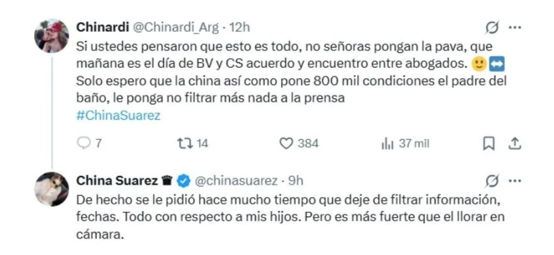 «Si ustedes pensaron que esto es todo, no señoras pongan la pava, que mañana es el día de acuerdo y encuentro de abogados de BV y CS. Sólo espero que la China, así como pone 800 mil condiciones, le imponga al «padre del baño» no filtrar más nada a la prensa #ChinaSuarez», comentó un usuario de la red social X.