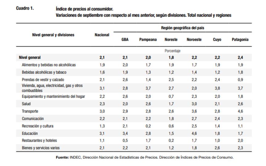El Instituto Nacional de Estadísticas y Censos (INDEC) dio a conocer que el Índice de Precios al Consumidor (IPC) en septiembre con respecto a agosto fue del 2,1% a nivel nacional. La región patagónica tuvo una inflación el pasado mes del 2,4%, la mayor cifra registrada entre todas las regiones que conforman el país. Cuáles fueron los rubros que más incremento tuvieron.