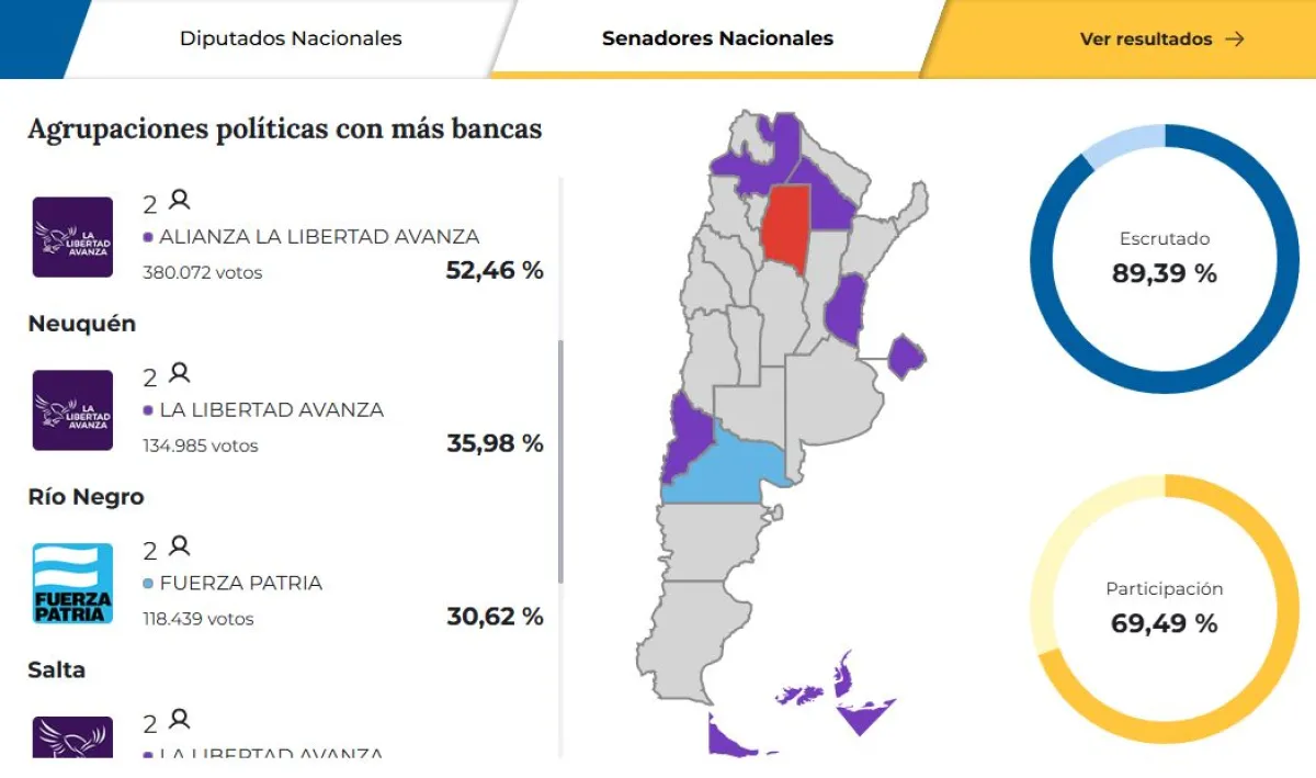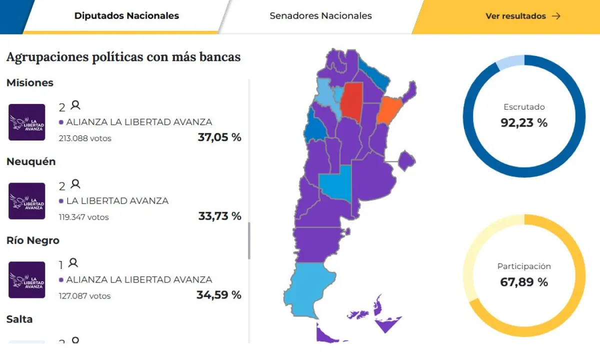 Los primeros resultados de las elecciones legislativas nacionales 2025 confirmaron que La Libertad Avanza se impone a nivel nacional con el 40,54% de los votos. Al momento del anuncio, se había escrutado el 91% de las mesas, consolidando la tendencia de victoria para la fuerza liderada por Javier Milei.
