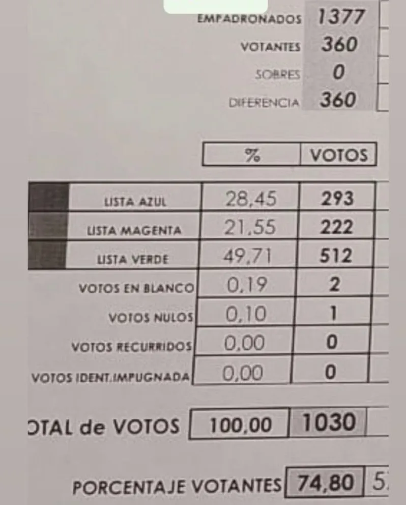 En los comicios participaron tres listas: la Azul, encabezada por Claudio Salazar y Luciana Torti; la Verde, de Alonso y Porro; y la Magenta, liderada por Eduardo Vargas y Mariela Gamero.