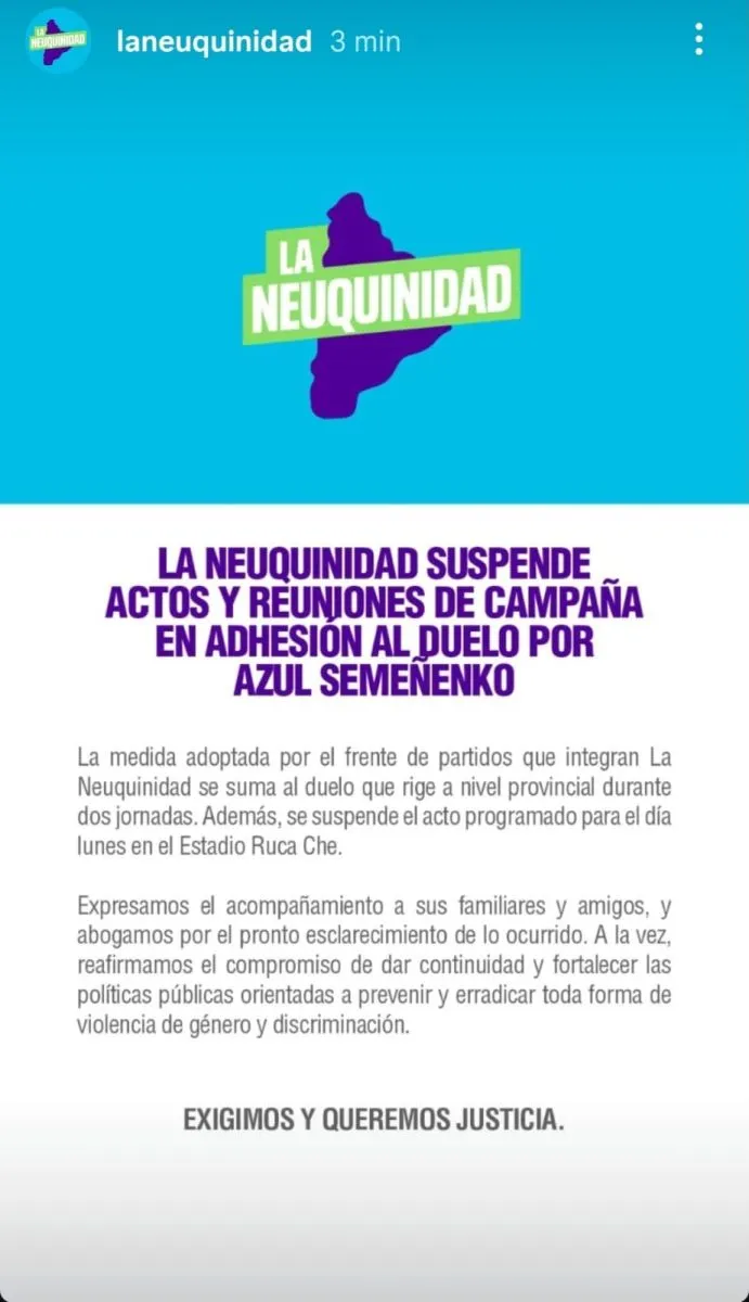 La Neuquinidad informó que suspende los actos y reuniones de campaña en adhesión al duelo provincial decretado por dos jornadas tras el crimen de Azul Semeñenko.