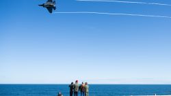 TOPSHOT - US President Donald Trump (2L) and First Lady Melania Trump (2R) watch an F-35 naval demonstration during a visit to the USS George H.W. Bush aircraft carrier which is out at sea near Norfolk, Virginia, October 5, 2025, as part of the US Navy's 250th anniversary celebration,
