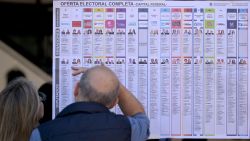 People look at a banner displaying an image of the ballot paper at a polling station during the national midterm legislative election in Buenos Aires on October 26, 2025. Argentines head to the polls for a midterm election that will determine whether President Javier Milei enters the second half of his term bolstered or diminished as economic troubles abound despite unprecedented US aid. (Photo by Juan MABROMATA / AFP) (Photo by JUAN MABROMATA/AFP via Getty Images)