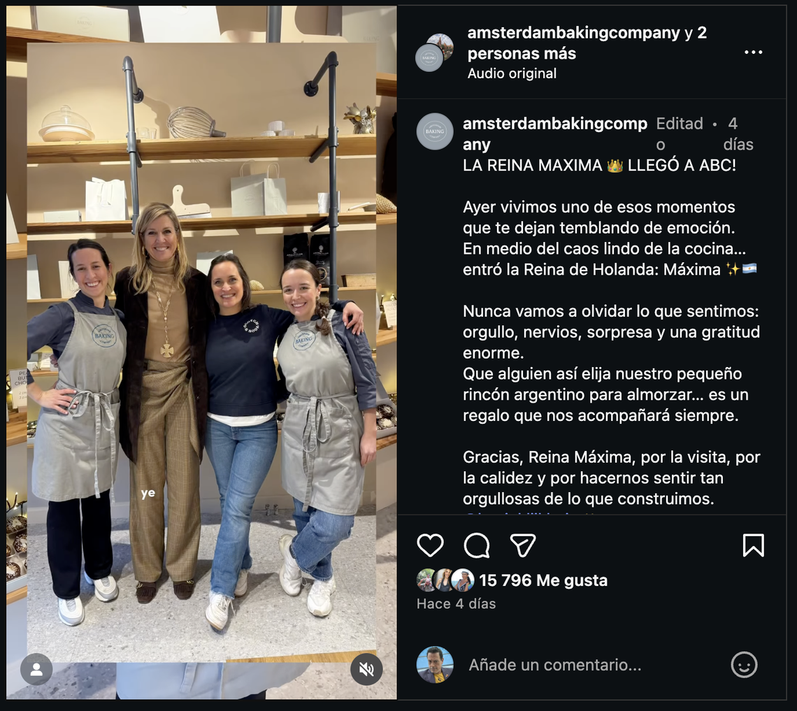 En el Instagram de la pastelería subieron un video que acompañaron con el siguiente texto: «LA REINA MAXIMA LLEGÓ A ABC!. Ayer vivimos uno de esos momentos que te dejan temblando de emoción. En medio del caos lindo de la cocina… entró la Reina de Holanda: Máxima . Nunca vamos a olvidar lo que sentimos: orgullo, nervios, sorpresa y una gratitud enorme».