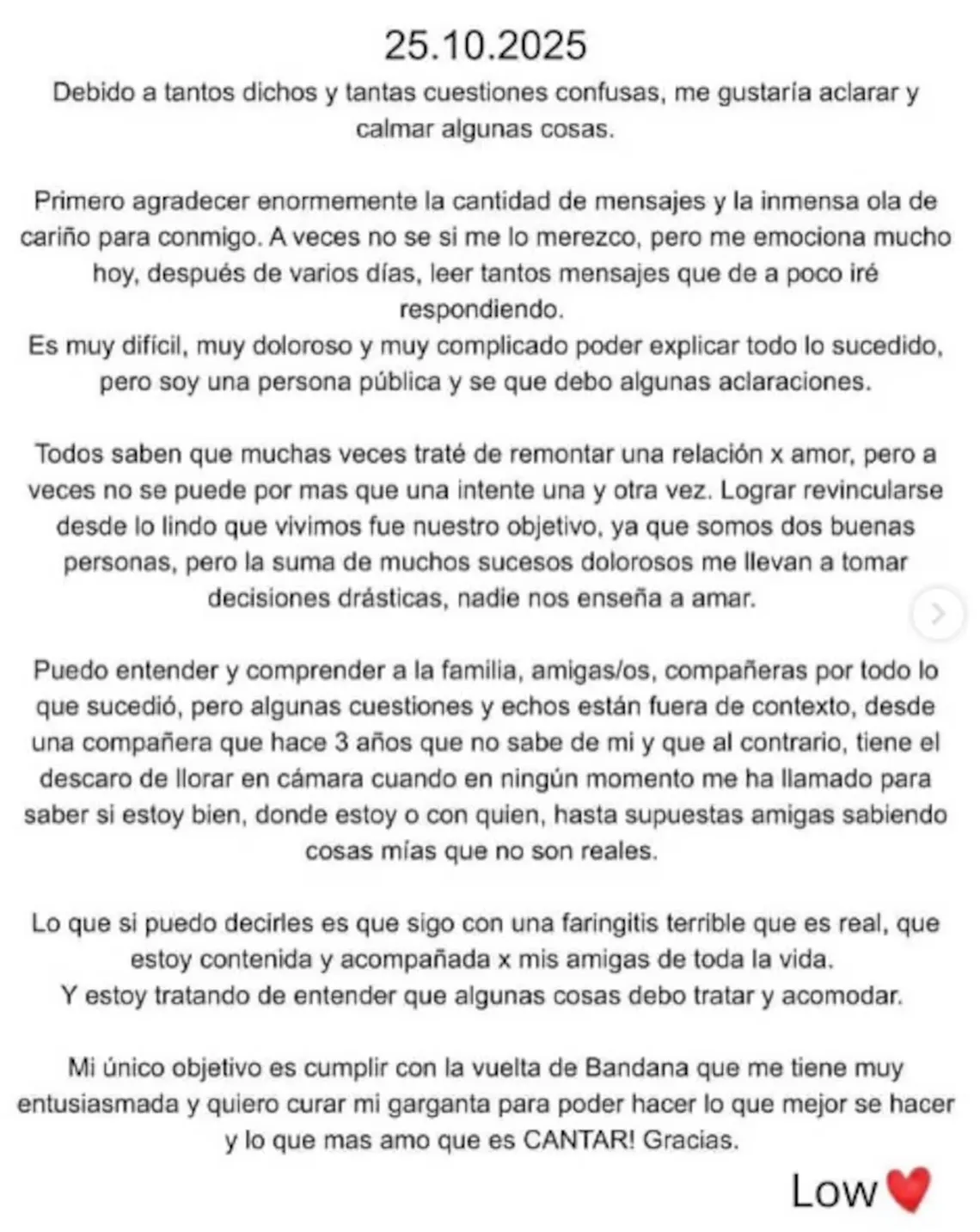 Finalmente, Lourdes cerró el comunicado con un mensaje esperanzador enfocado en su regreso a la música. “Mi único objetivo es cumplir con la vuelta de Bandana, que me tiene muy entusiasmada. Quiero curar mi garganta para poder hacer lo que mejor sé hacer y lo que más amo: cantar. Gracias”, concluyó.