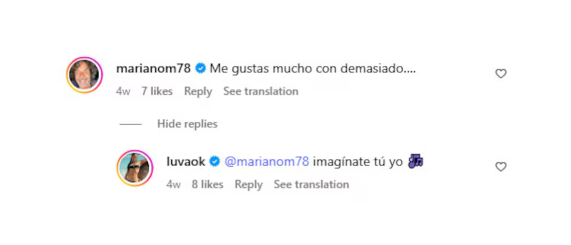 Karina Iavicoli detalló alguno de los mensajes que el reconocido actor le deja a la joven en los posteos «Me gustás mucho, demasiado» o «Tu energía no la iguala nadie», textos que no pasaron inadvertidos para Luva, que respondió «imagínate tú yo».