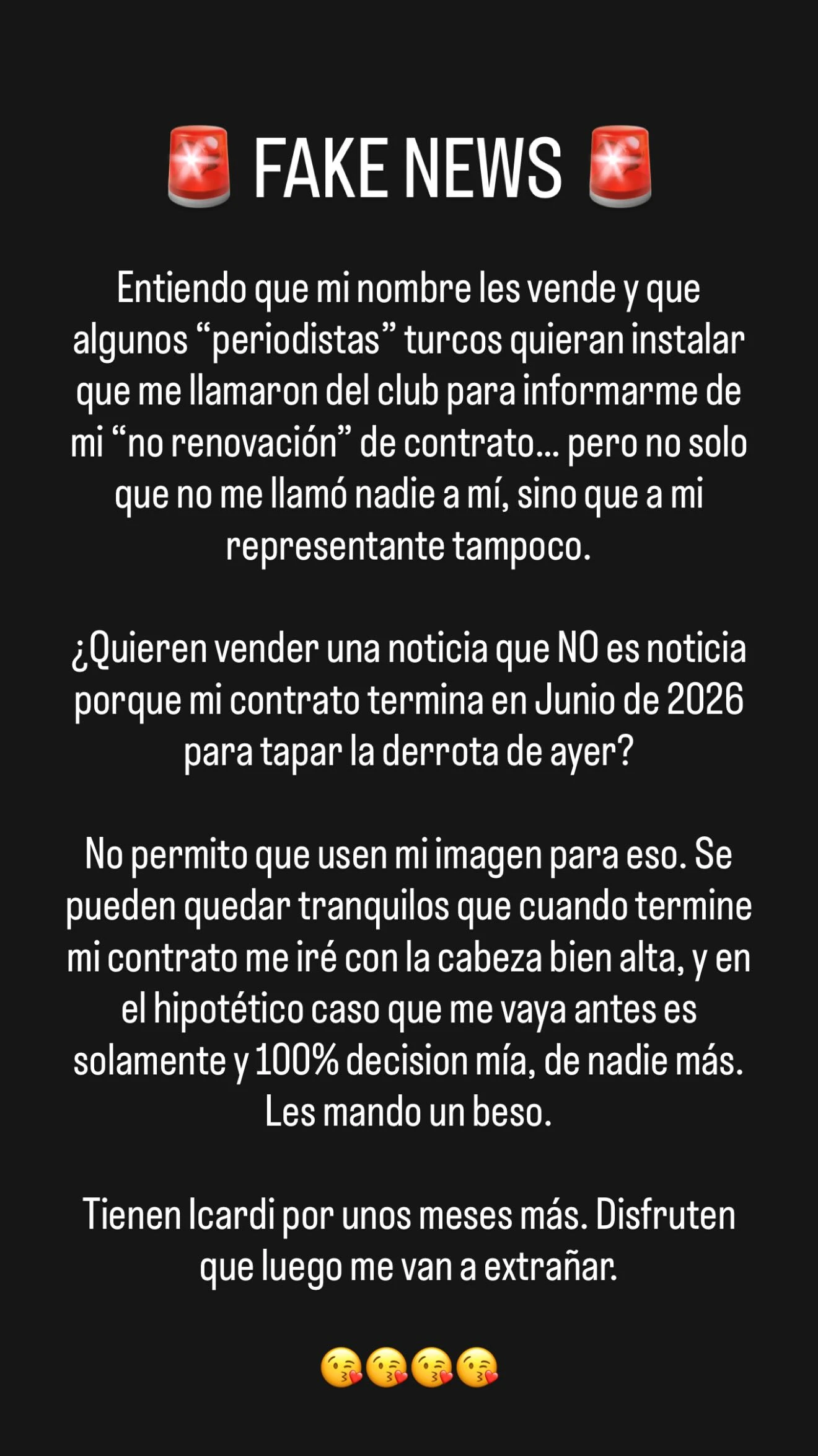 Pero lejos de aceptar ese guion, Icardi salió al cruce este miércoles con un descargo público, directo y cargado de ironía en sus redes sociales. “Fake news”, comenzó, y sostuvo que ni él ni su representante recibieron llamado alguno desde el club. Más aún: recordó que su vínculo con el conjunto turco se extiende hasta junio de 2026. En ese sentido, acusó a “algunos periodistas” de usar su nombre para tapar una derrota reciente del club, e insistió en que su eventual salida —si llegara a ocurrir antes del fin del contrato— será “100% decisión mía, de nadie más”. Cerró con una frase lapidaria: “Tienen Icardi por unos meses más. Disfruten que luego me van a extrañar.”