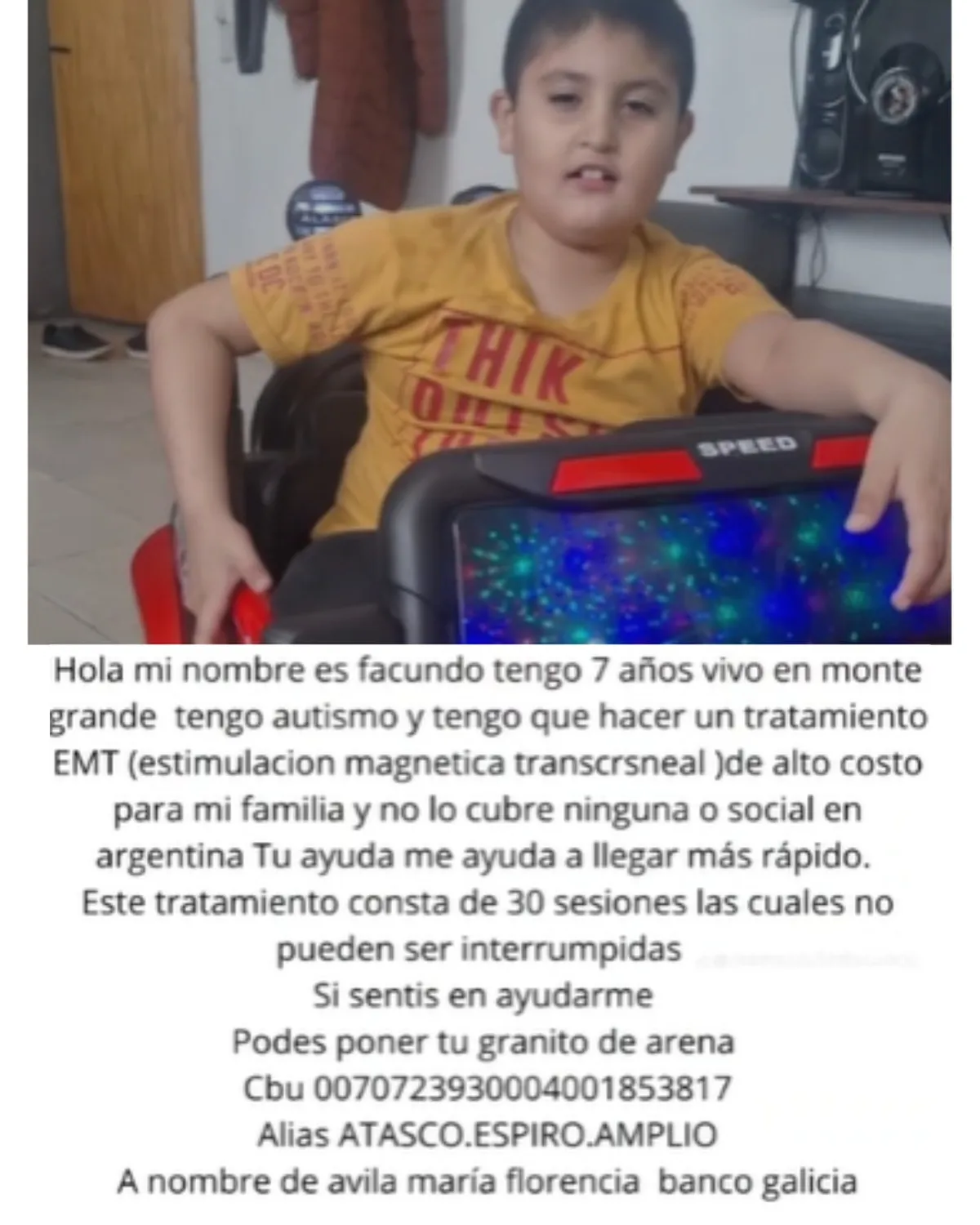 Facundo es un niño de 7 años que tiene autismo y debe realizar un complejo tratamiento para poder contar con una mejor calidad de vida. Así es como la familia, vecina de Monte Grande, pide ayuda a la comunidad para conseguir los fondos necesarios que permitan realizar los estudios correspondientes, que tienen un costo de 20 mil dólares.