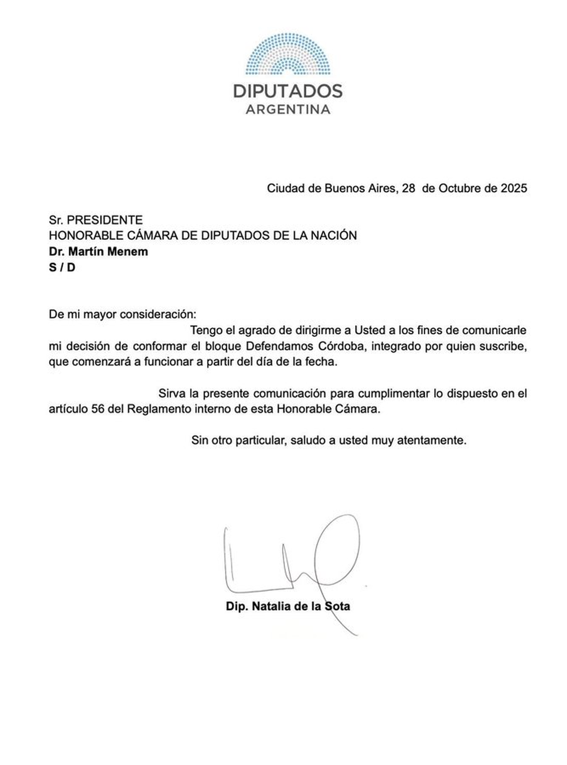La legisladora publicó en la red social X que «el domingo recibimos, en las urnas, un mandato de los cordobeses. Para cumplir con la palabra y continuar nuestro camino de coherencia, hoy conformé el nuevo bloque ´Defendamos Córdoba´ en la Cámara de Diputados».