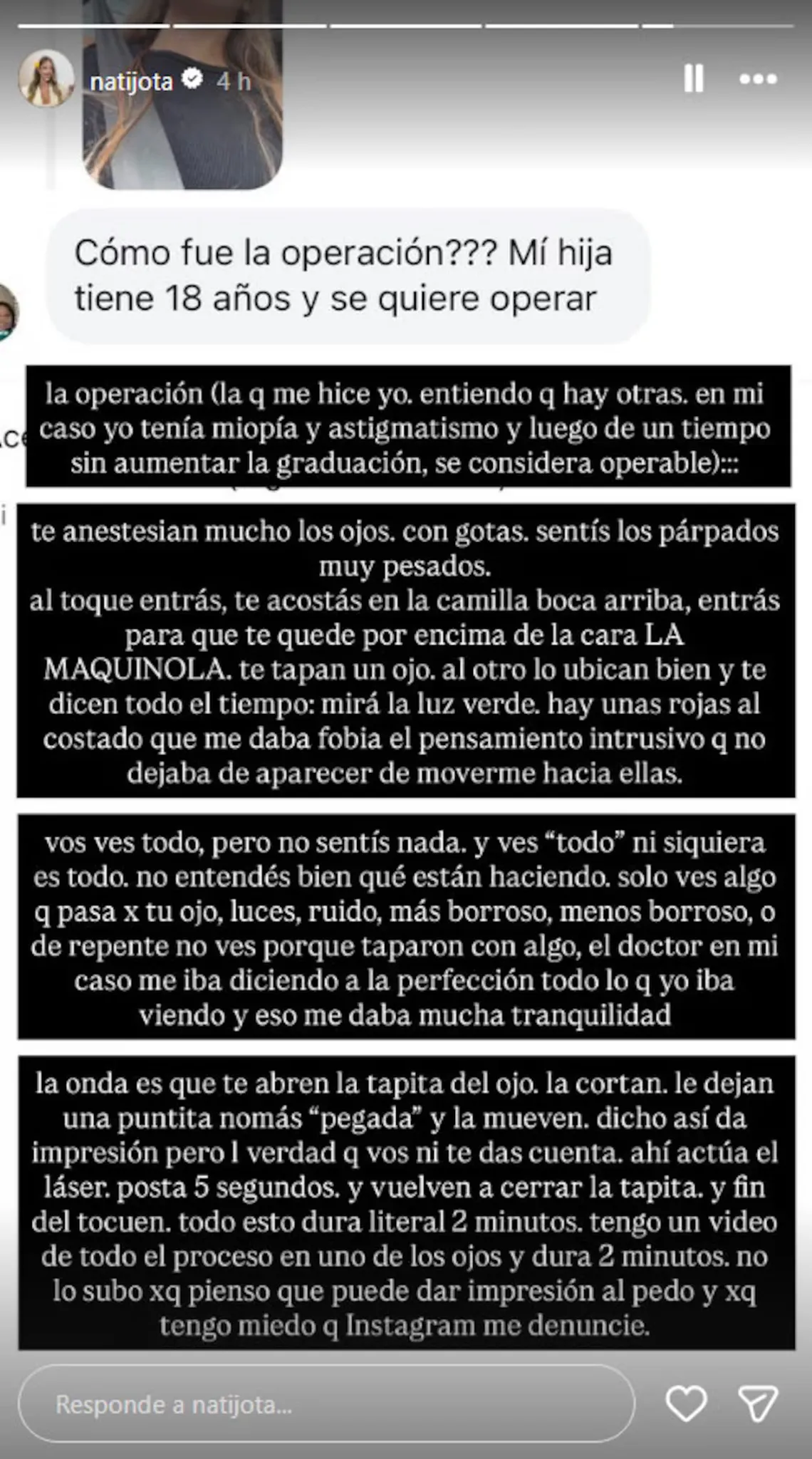 «Abren la tapita del ojo, la cortan, le dejan una puntita ‘pegada’ y la mueven. Dicho así da impresión, pero la verdad es que no ves ni te das cuenta. Ahí actúa el láser, posta cinco segundos, y vuelven a cerrar la tapita. Fin del toque. Todo eso dura, literal, dos minutos. Tengo un video de todo el proceso en uno de los ojos y dura dos minutos. No lo subo porque puede dar impresión al pedo, y porque tengo miedo de que Instagram me denuncie», contó, Nati.