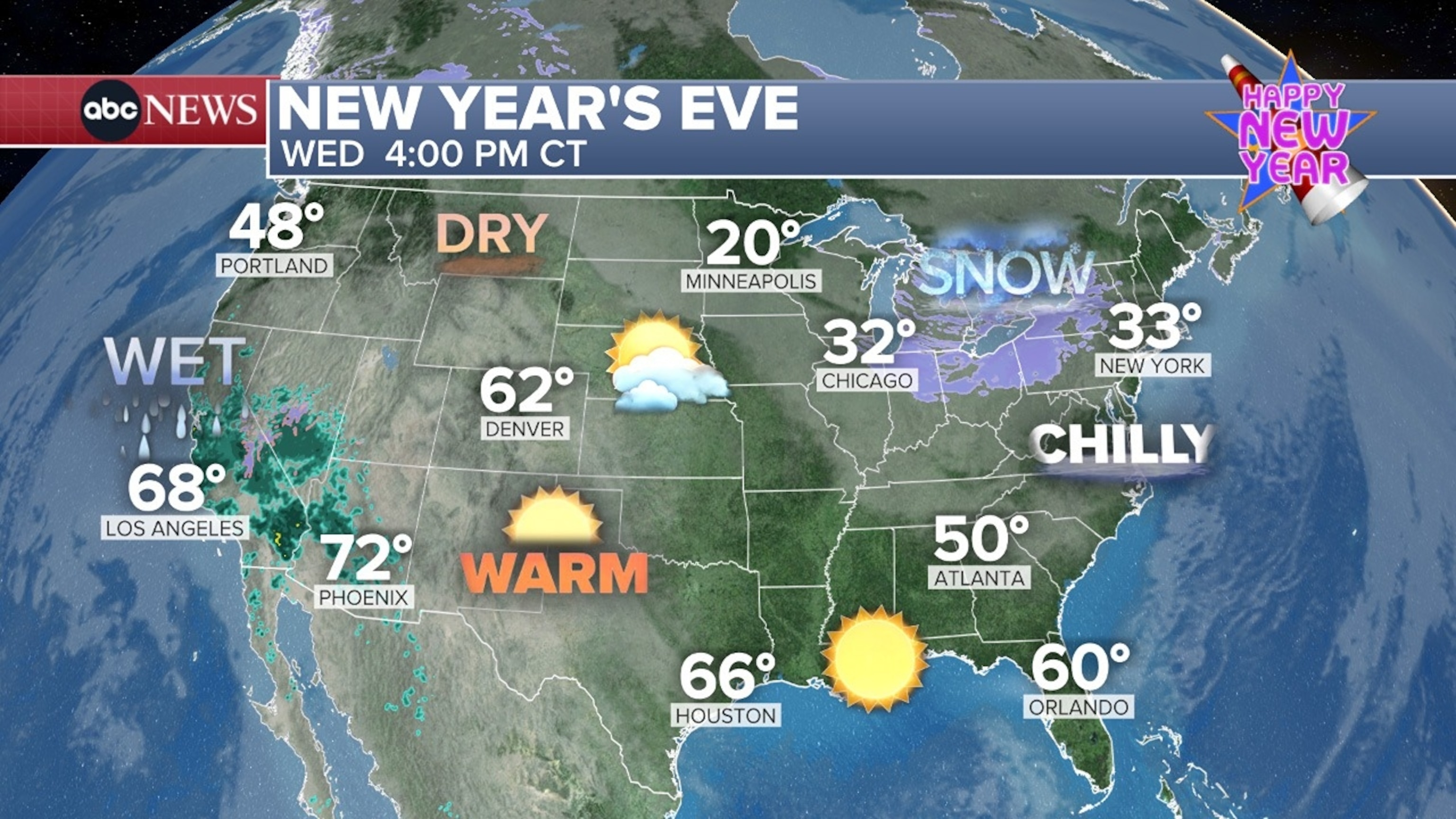 In the Northeast, another cold front is moving through on Wednesday and Thursday, which brings the slight chance for a few snow flurries to mix in with confetti as the ball drops in Times Square. But no measurable snow accumulation is expected and the flurries will be gone by sunrise on Thursday.
