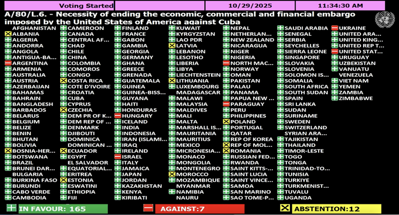 La resolución cubana, que pedía el fin del embargo mantenido por EE.UU. por más de seis décadas, fue condenada por trigésima tercera oportunidad. Recibió un apoyo abrumador de 165 votos a favor, mientras que solo siete naciones votaron en contra.