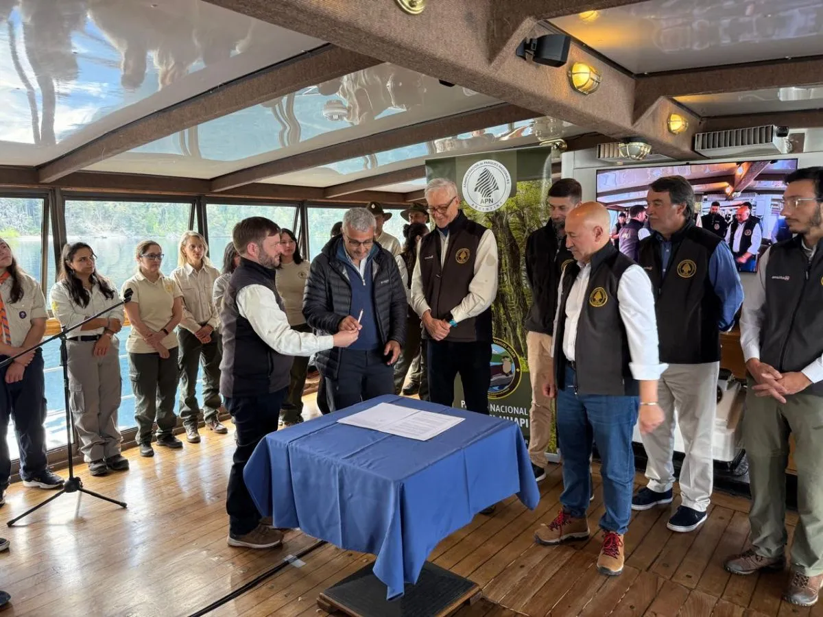 Más allá de dejar allí una ofrenda floral, en conmemoración de la fecha, a bordo de la nave, el presidente de Parques Nacionales, Sergio Álvarez, firmó in convenio de cooperación con la Municipalidad de Villa La Angostura, destinado a fortalecer acciones conjuntas en materia de conservación, turismo e información, así como otro con Consensos Patagónicos.