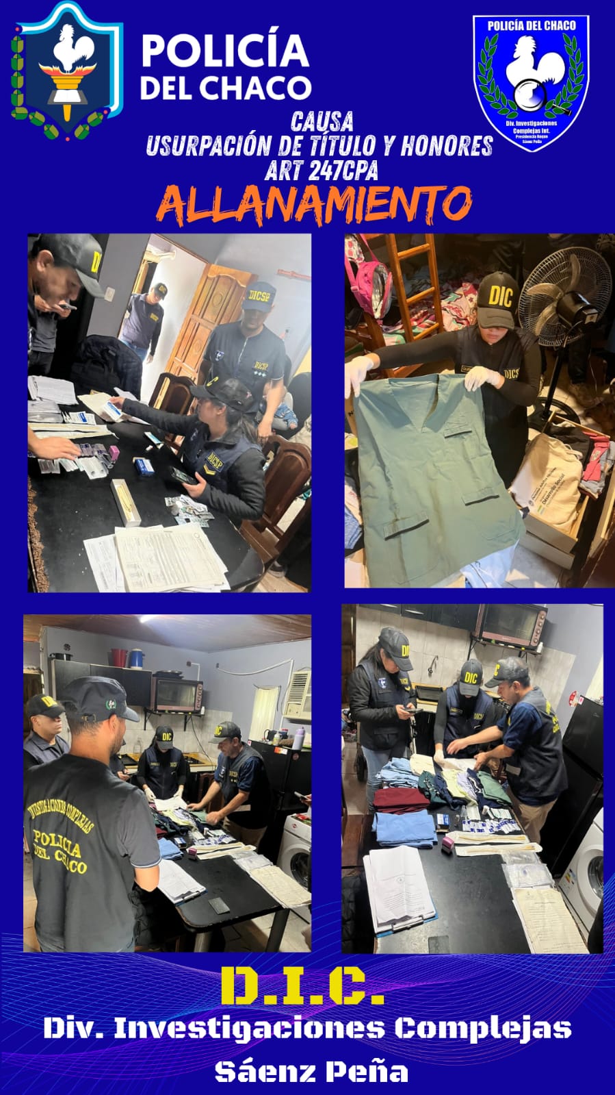 Personal de la División Investigaciones Complejas del Interior de Sáenz Peña realizó allanamiento en una vivienda del barrio San Cayetano de Sáenz Peña, en el marco de una causa por “Supuesta Usurpación de Título y Honores”, prevista en el artículo 247° del Código Penal Argentino.