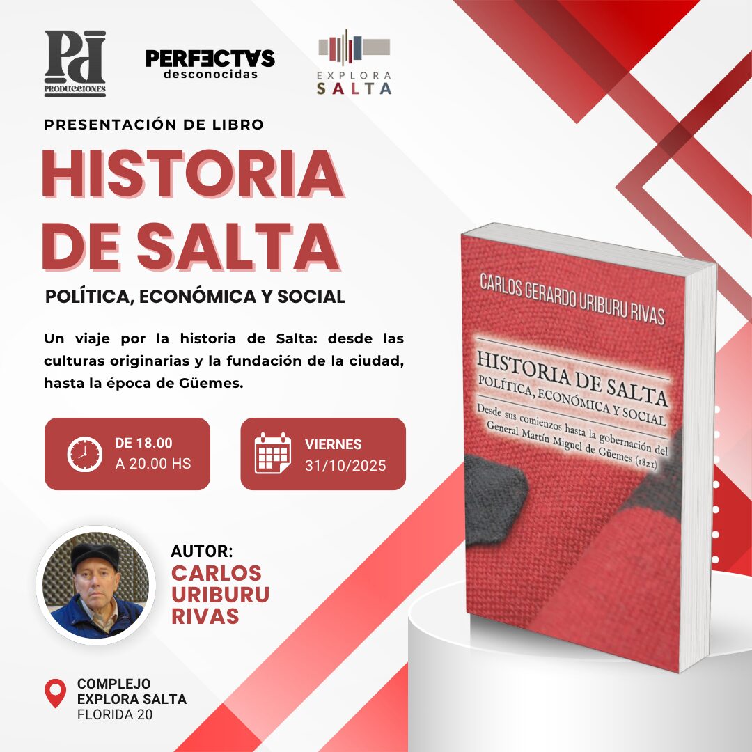 El viernes 31 de octubre a las 18 h, en el Complejo Explora Salta (Florida 20), se presentará el libro “Historia de Salta: Política, Económica y Social. Desde sus comienzos hasta la Gobernación del General Martín Miguel de Güemes (1821)”, del historiador Carlos Uriburu Rivas. La actividad será con entrada libre y gratuita y propone un encuentro de reflexión sobre la memoria e identidad salteña.