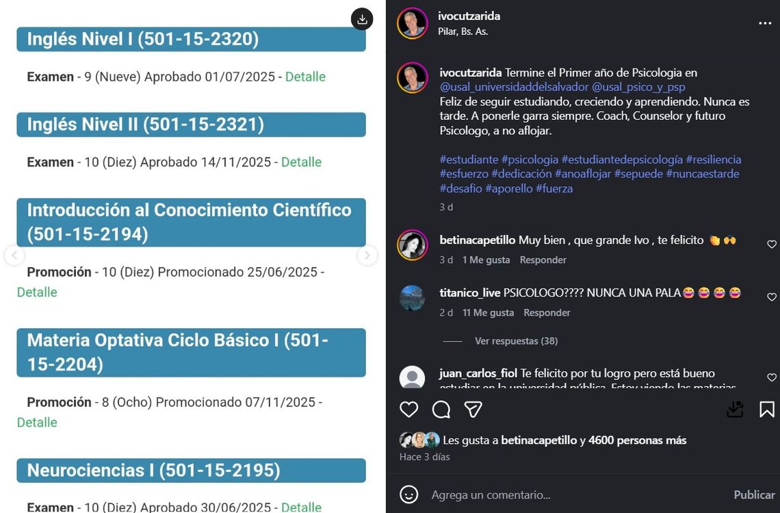 El exgalán de tantas tardes de televisión compartió los frutos de este 2025 en el que empezó a cursar y que acaba de terminar con varios logros «debajo del brazo». Entre las 10 materias que cursó y que aprobó destacan Neurociencias I, Perfiles y competencias del psicólogo y del psicopedagogo, y Psicología de la interacción social y los pequeños grupos.