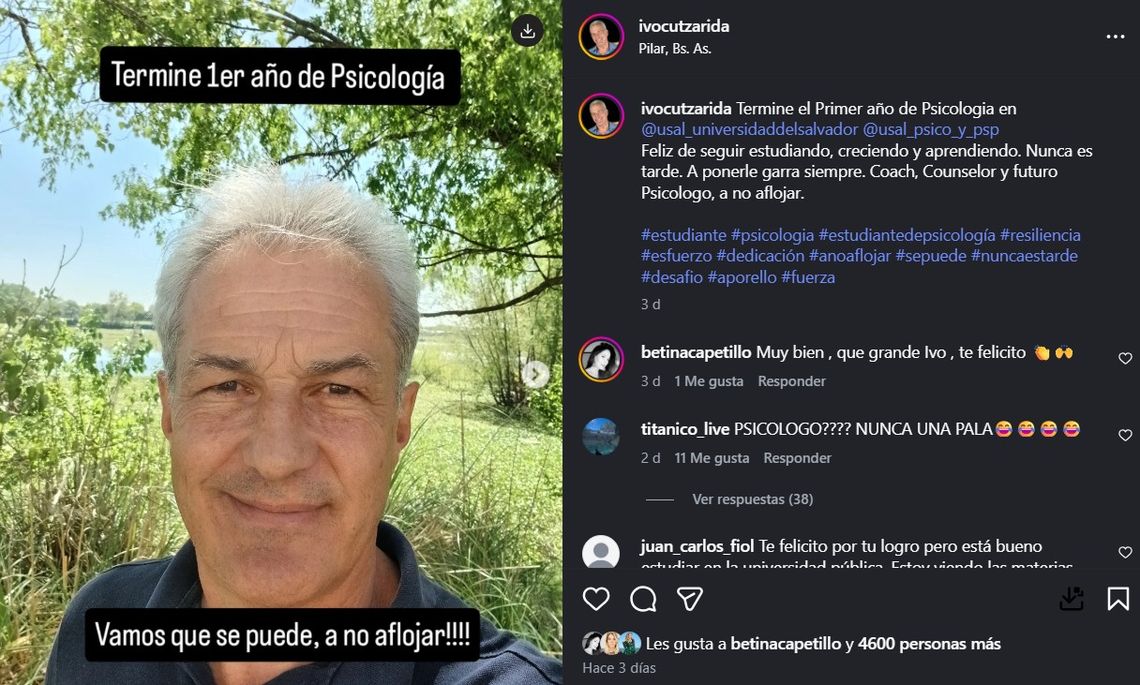 «Terminé el Primer año de Psicología. No había rastros de impostura ni de pose. Solo gratitud y entusiasmo. “Feliz de seguir estudiando, creciendo y aprendiendo. Nunca es tarde. A ponerle garra siempre”, compartió Ivo, a través de su cuenta oficial de Instagram. Y generó sorpresa entre sus seguidores, que no conocían el gran paso que decidió dar el actor.