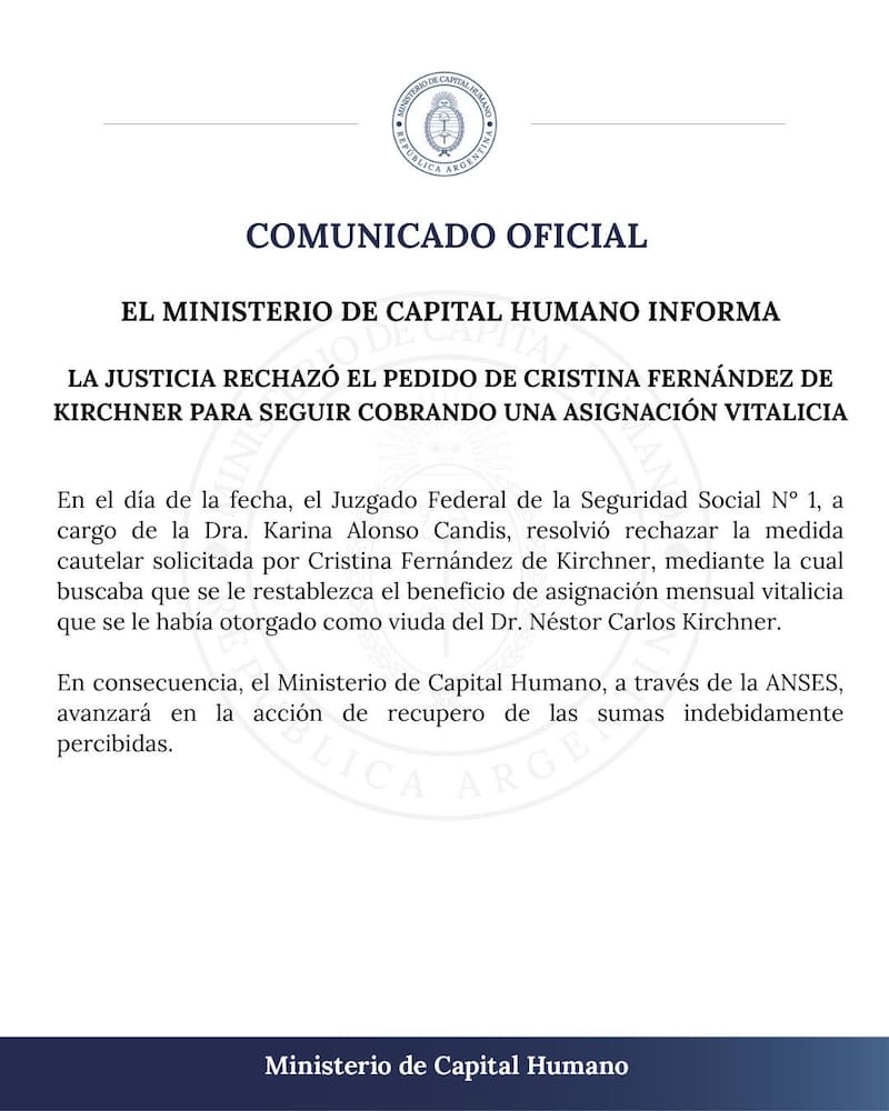 El Juzgado Federal de la Seguridad Social N°1, a cargo de Karina Alonso Candis, rechazó este miércoles el pedido realizado por la ex presidenta Cristina Kirchner para que se le restableciera el beneficio de la asignación mensual vitalicia que percibía como viuda del fallecido ex mandatario Néstor Kirchner.