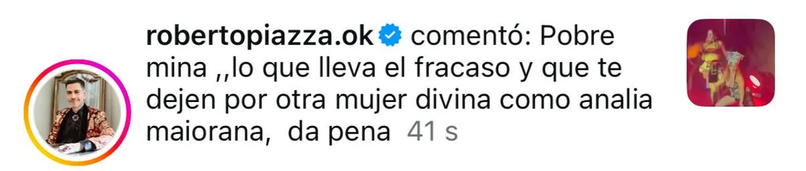 El comentario más fuerte fue el que publicó el -siempre frontal y polémico- diseñador de alta costura Roberto Piazza subió un fuerte posteo en Instagram: “Pobre mina, lo que lleva el fracaso y que te dejen por otra mujer divina como Analía Maionara, da pena”.