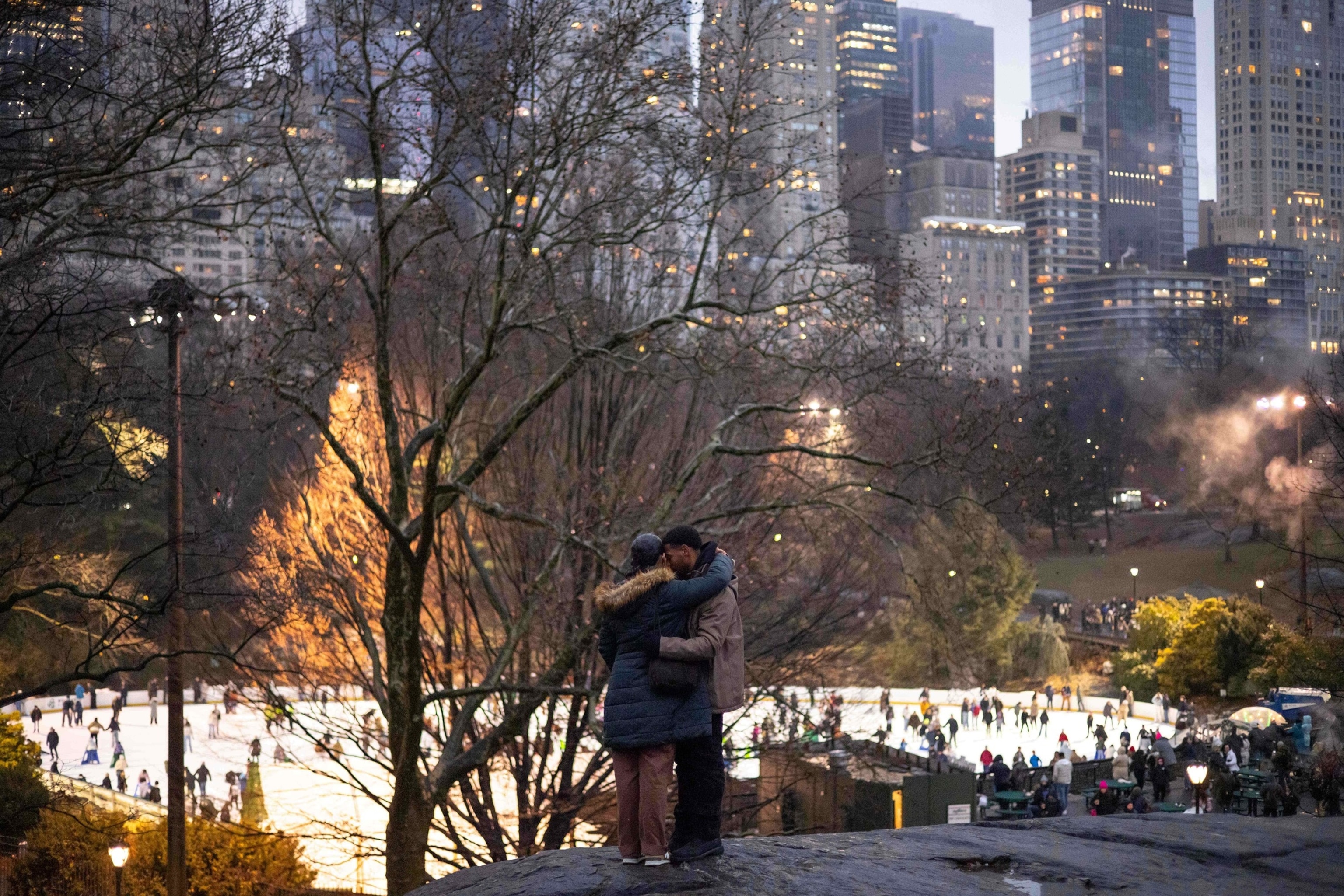 La gente se abraza cerca de Wollman Rink en Central Park en Nueva York.