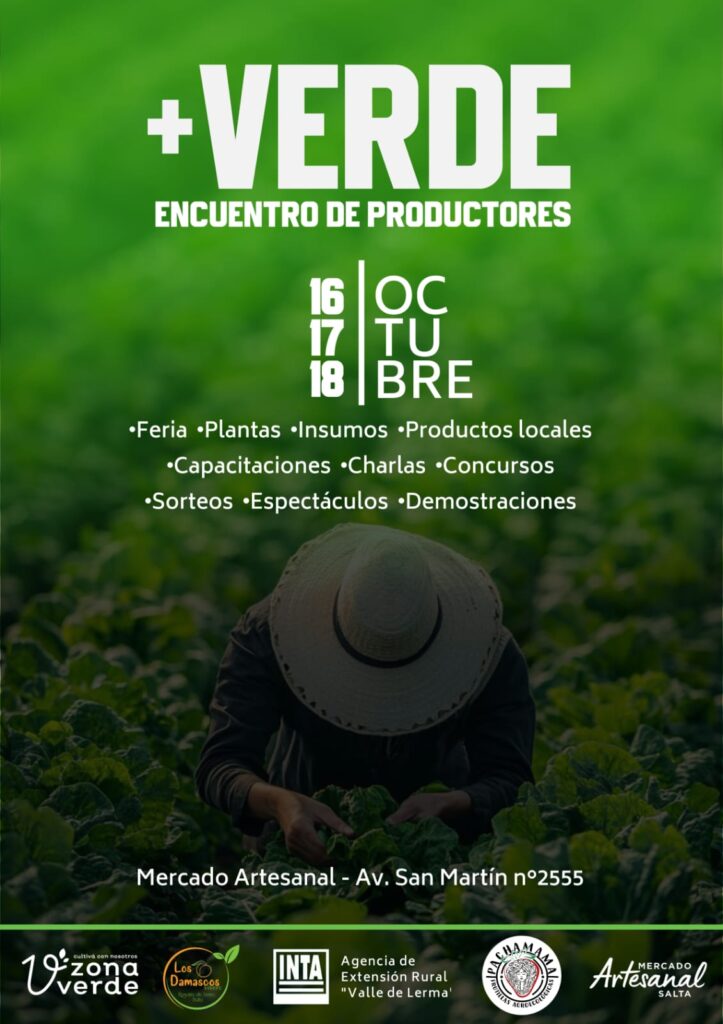 Con el apoyo del Mercado Artesanal, se llevará a cabo el evento +Verde organizado por Zona Verde, INTA AER Valle de Lerma, Viveros Los Damascos y Pachamama Frutilla Agroecológica, con el objetivo de crear lazos en la comunidad de productores, visibilizar la producción local, promover prácticas sustentables y compartir información directa de profesionales en la materia.