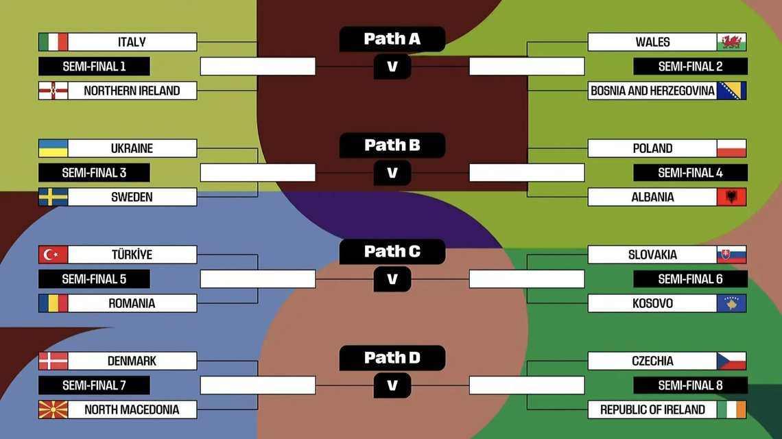 Por otro lado, en cuanto a los países europeos, Italia chocará con Irlanda del Norte, para luego jugar contra el ganador de Gales vs. Bosnia y Herzegovina, por el cruce 1; Ucrania irá ante Suecia y Polonia con Albania en el Cruce 2; Turquía se enfrentará con Rumania y Eslovaquia ante Kosovo en el Cruce 3, mientras que en el Cruce 4 Dinamarca chocará con Macedonia del Norte y República Checa vs. Irlanda. El formato es sencillo: semifinal y final, a partido único y las cuatro vencedoras irán al Mundial.