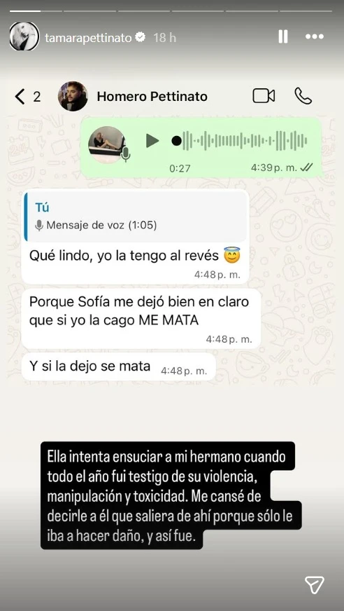 Junto a ese descargo, Tamara compartió un chat en el que se leía que su hermano le decía: «Sofía me dejó bien en claro que si yo la cago, me mata. Y si la dejo, se mata».