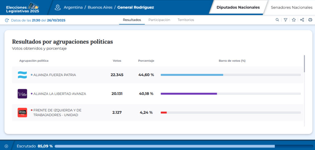 Escrutado más del 85% de las mesas, en General Rodríguez la lista más votada de diputados nacionales es la de Frente Patria, con el 44.60% de los votos. La Libertad Avanza 40.18%. En septiembre fue 43.12% FP 36.33% LLA