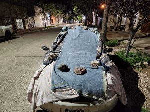 Como consecuencia de ello, y ante un nuevo Alerta, Naranja en este caso, emitido por el Servicio Meteorológico Nacional, que advierte fuertes ráfagas de viento, lluvia y posible caída de granizo, quienes no cuentan con un garage o similar para guardar sus automóviles, ponen sobre éstos todo lo que tienen a mano, al tiempo que buscan aleros y árboles, para evitar que la piedra los dañe, o vuelva a dañarlos.