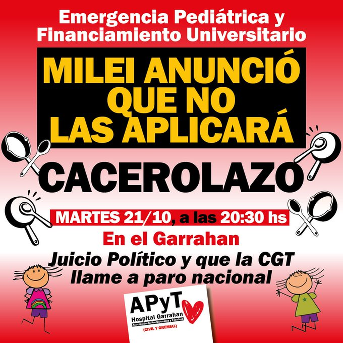 La convocatoria, que está anunciada a las 20:30 este martes, en la entrada sobre Combate de los Pozos 1881, será llevada a cabo en un contexto de un paro por 24 horas y ante una situación “gravísima para la democracia” del país y también “para los niños, niñas y adolescentes del Garrahan y sus trabajadores”.