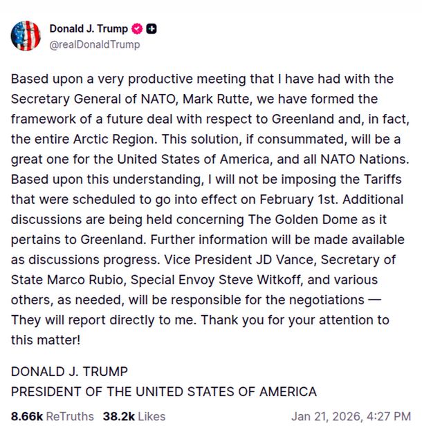 «Esta solución, si se produce, será grandiosa para los Estados Unidos de América, y para todas las naciones de la OTAN. Basándome en este entendimiento, no impondré aranceles que estaban programados para entrar en vigencia el 1o de febrero», agregó.