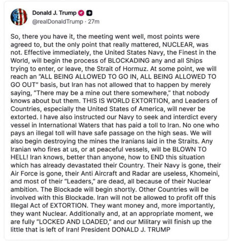 «La reunión fue bien, se llegó a un acuerdo sobre la mayoría de los puntos, pero el único punto realmente importante, el armamento nuclear, no se aprobó. Con efecto inmediato, la Armada de Estados Unidos, la mejor del mundo, comenzará a bloquear a todos los buques que intenten entrar o salir del estrecho de Ormuz», escribió en su red Truth Social.