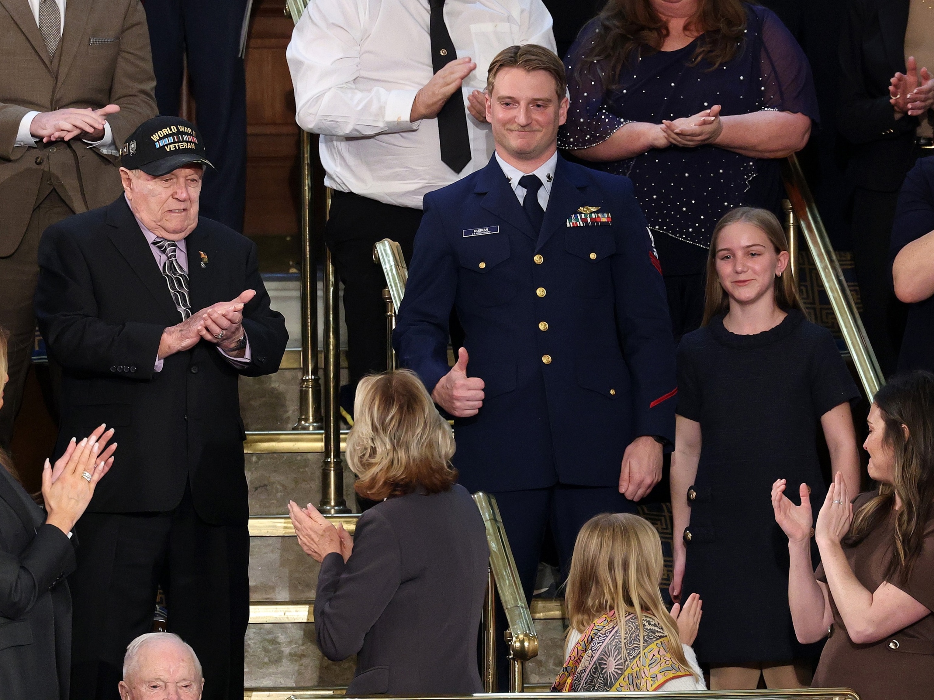 El suboficial de tercera clase de la Guardia Costera de los EE. UU., Scott Ruskan, es honrado cuando el presidente de los EE. UU., Donald Trump, pronuncia su discurso sobre el estado de la Unión durante una sesión conjunta del Congreso en el Capitolio de los EE. UU. el 24 de febrero de 2026 en Washington, DC.