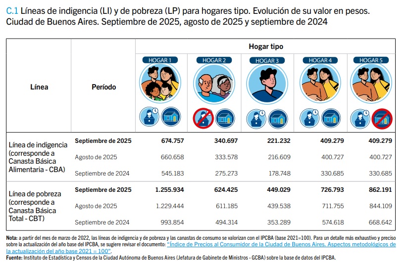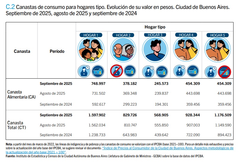 El Instituto de Estadística y Censos porteño informó que en septiembre, la línea de pobreza para una familia de 4 miembros y propietaria de la vivienda creció 2,2% respecto de agosto de 2025. Para el mismo tipo de hogar, la Canasta alimentaria ascendió a los $748.997.