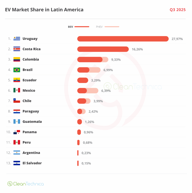 De acuerdo a la publicación, Uruguay es el líder indiscutido de la región con el 27,97% respecto a la penetración del mercado, seguido por Costa Rica, que cuenta con el 16,26%. Ambos países representan una cuota de mercado 100 veces superior a la de mercados más rezagados como Argentina y El Salvador. En tanto el país vecino, sigue siendo el único mercado mediano sin una electrificación significativa.