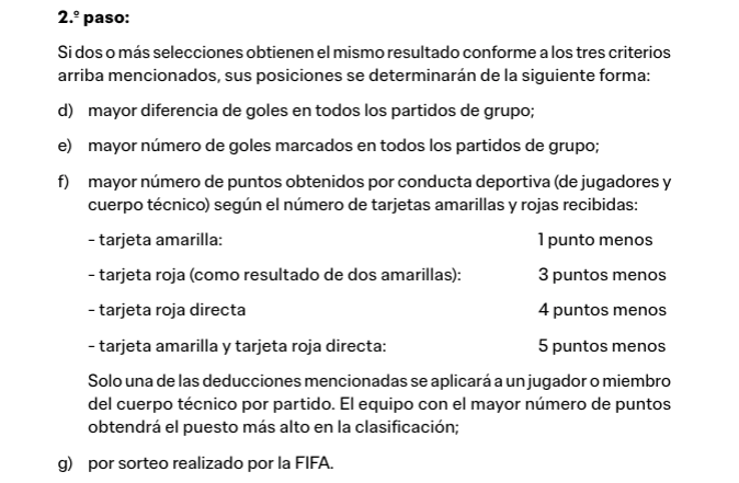 En el cuarto punto se tienen en cuenta la mayor diferencia de goles en todos los partidos del grupo y en el quinto, la mayor cantidad de goles anotados en todos los partidos del grupo.