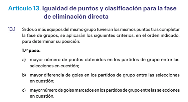 El mayor número de puntos obtenidos es el primer punto, lo normal y habitual. El segundo es la mayor diferencia de goles entre las selecciones que están igualadas y el tercer punto es el mayor número de goles marcados en el enfrentamiento directo.