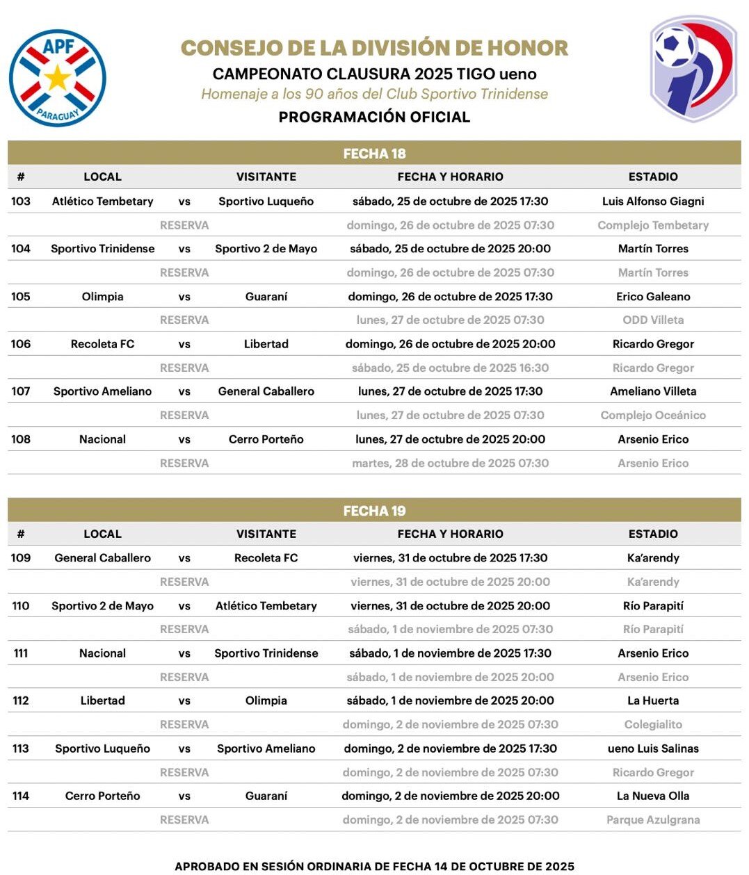 En la fecha 18 hay clásico más añejo entre Olimpia y Guaraní, que está marcado para el 26 de octubre desde las 17:30 en cancha de Capiatá. En esa misma fecha Nacional y Cerro también se verán las caras, el lunes 27 de octubre desde las 20:00.