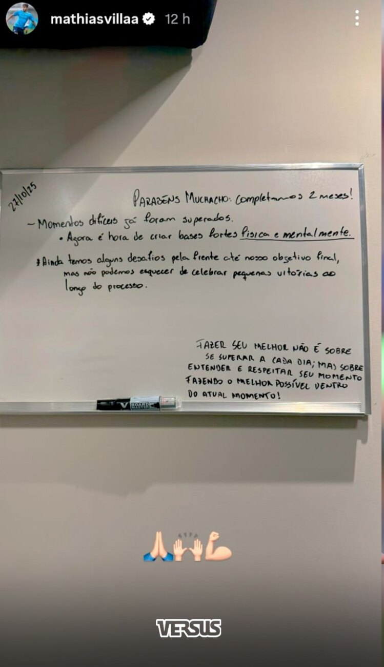 El jugador compartió un mensaje que le dejó su equipo médico con algunos mensajes positivos como: «Los momentos más difíciles ya fueron superados. Ahora es hora de crear bases fuertes físicas y mentales para llegar al objetivo final» decía la pizarra.