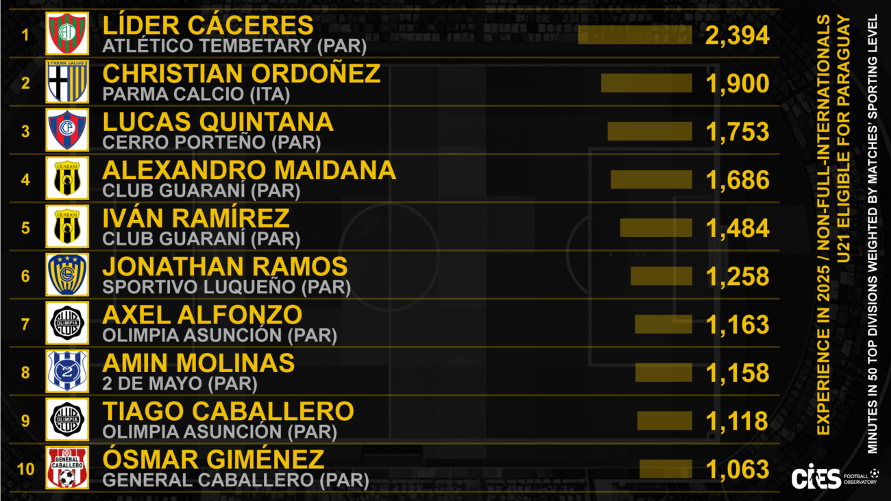 En este caso, el informe incluye a futbolistas sub 21 paraguayos que tuvieron un 2025 con mucha regularidad en torneos de Primera División de 50 ligas del mundo.
