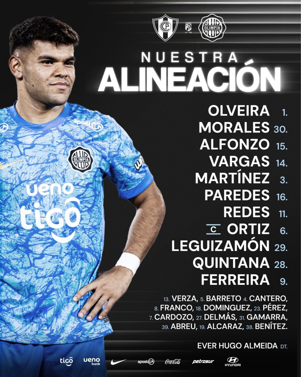 El once de Olimpia confirmado para el clásico: Gastón Olveira; Lucas Morales, Axel Alfonzo, Gustavo Vargas, David Martínez, Abel Paredes; Rodney Redes, Richard Ortiz, Hugo Quintana; Iván Leguizamón y Sebastián Ferreira.