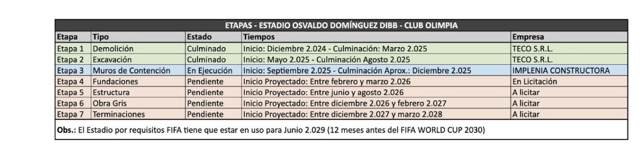 En dicho comunicado Olimpia muestra las etapas de la construcción del estadio, detalladamente. Actualmente está en la etapa 3 (muros de contención), superando ya las primeras, demolición y excavación.